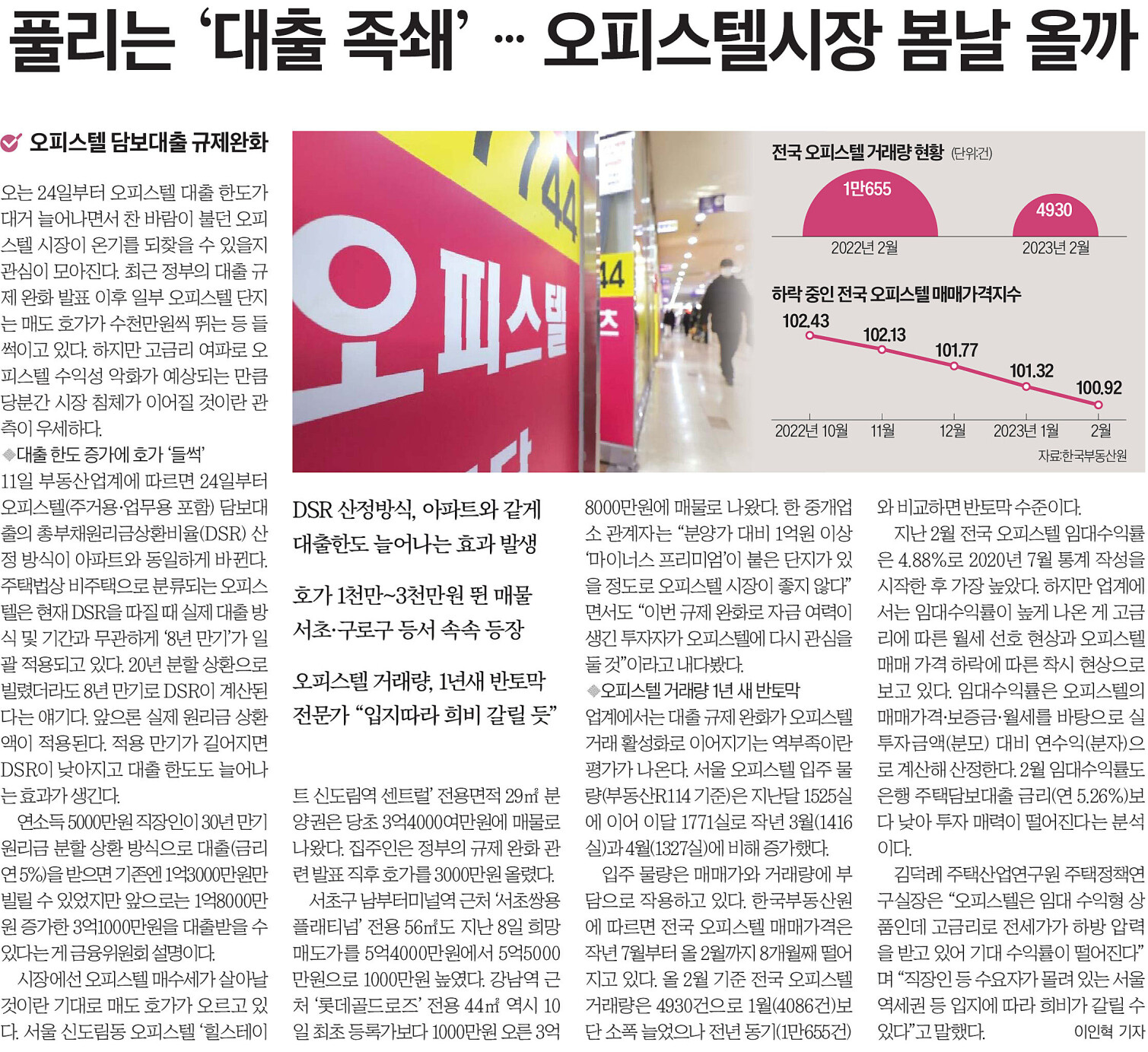 오피스텔 (주거용, 업무용 모두 포함) 담보대출 DSR 산정 방식이 아파트와 동일하게 바뀜.